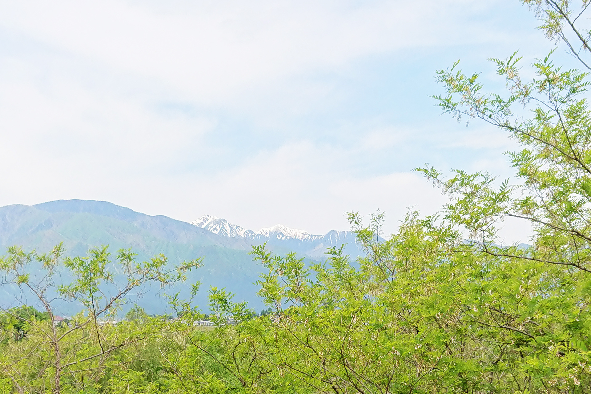 新緑と遠くに常念岳
