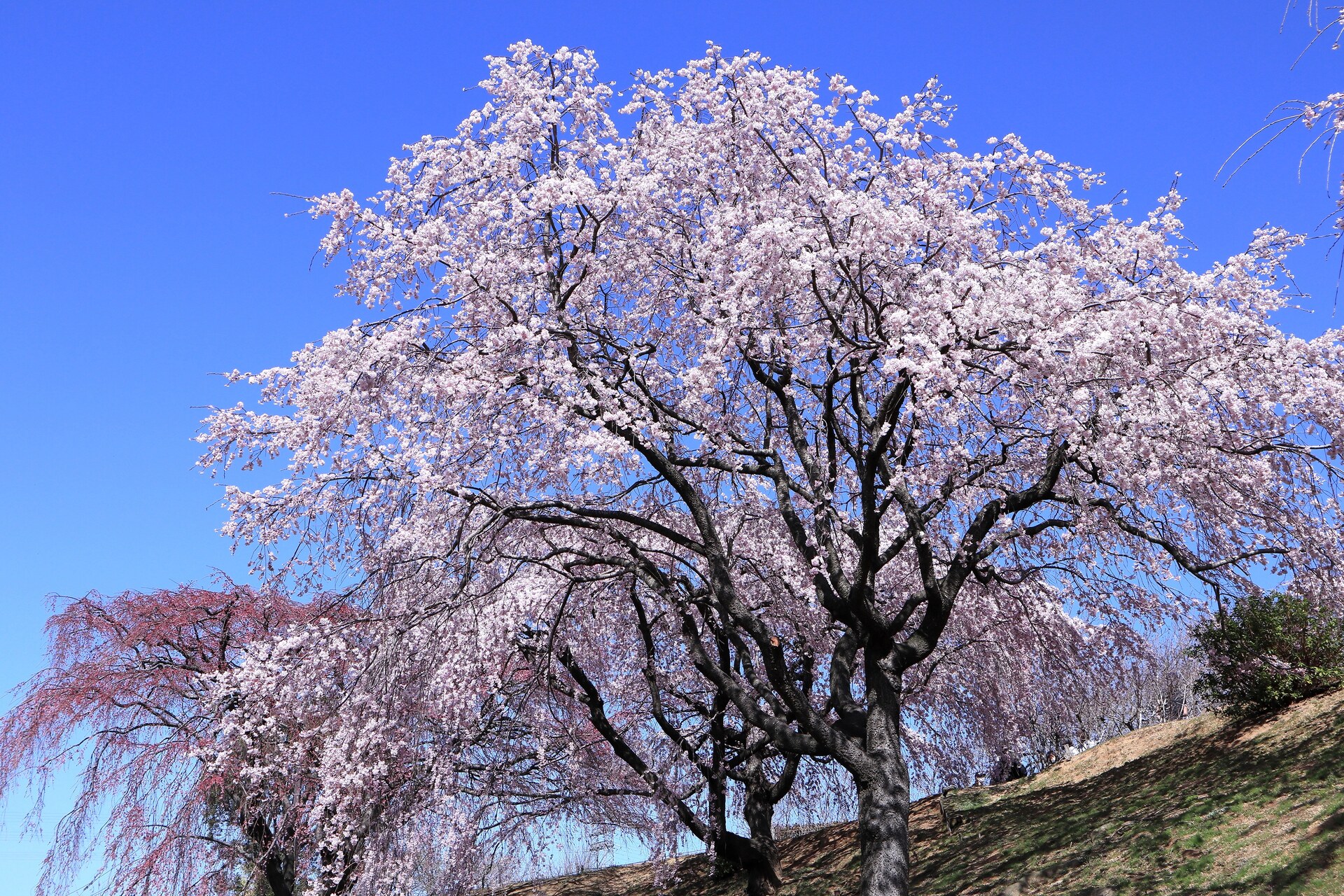 手前と、奥に見える薄いピンクの桜。奥の、濃いピンクの桜。それらが青空に映えて、とても綺麗ですね。