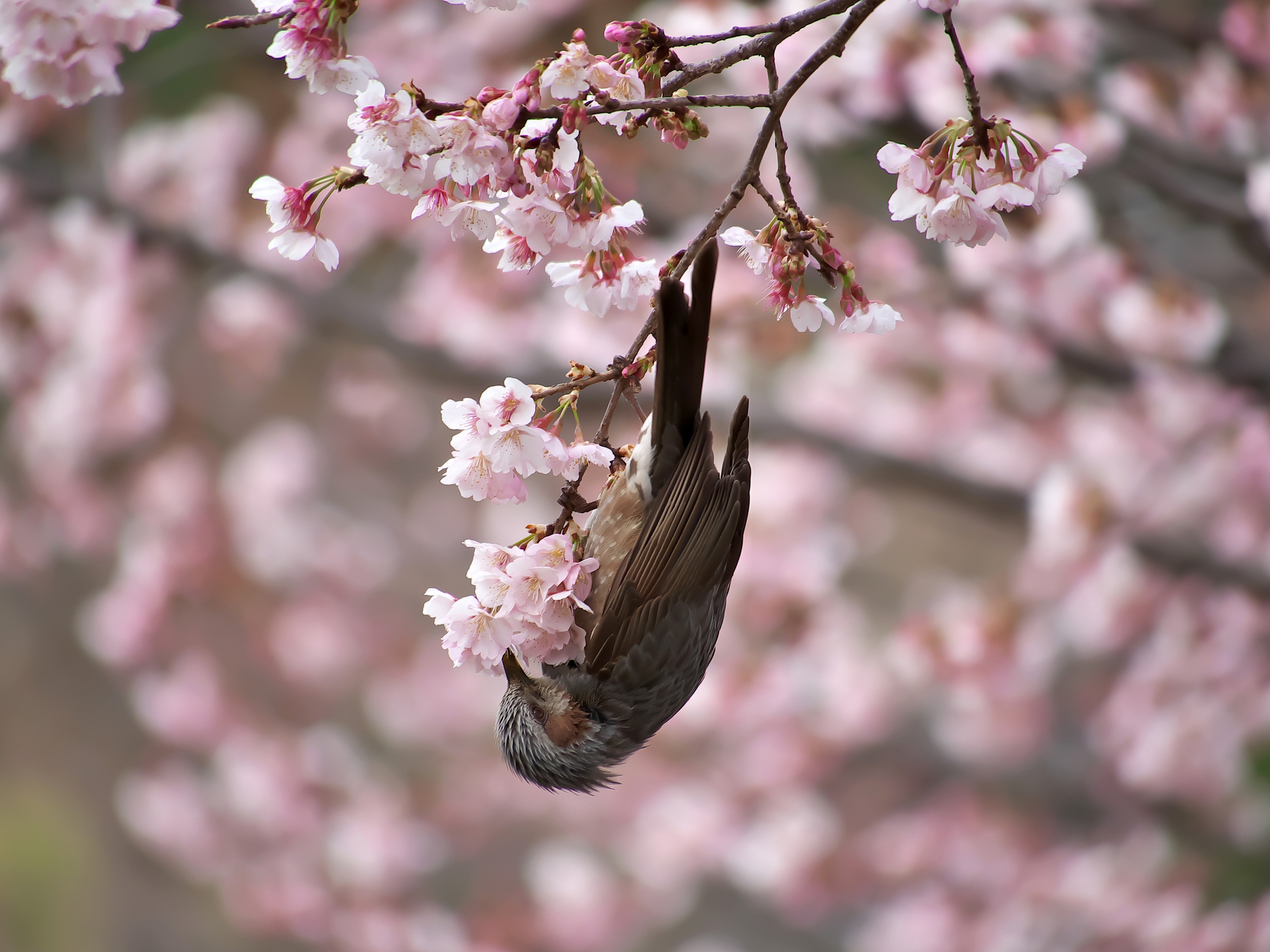 ヒヨドリとヒガンザクラ