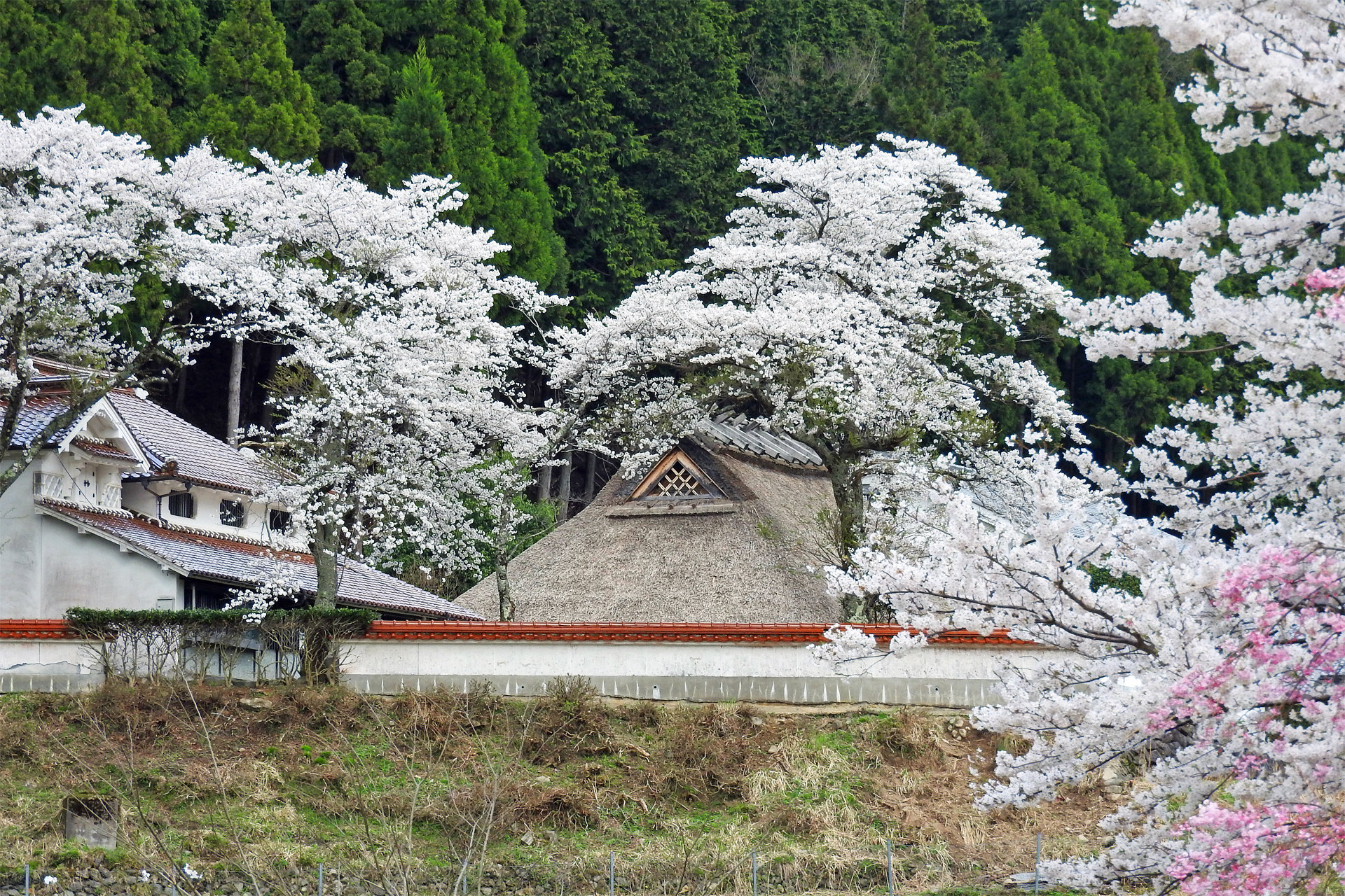 茅葺き屋根に満開の桜