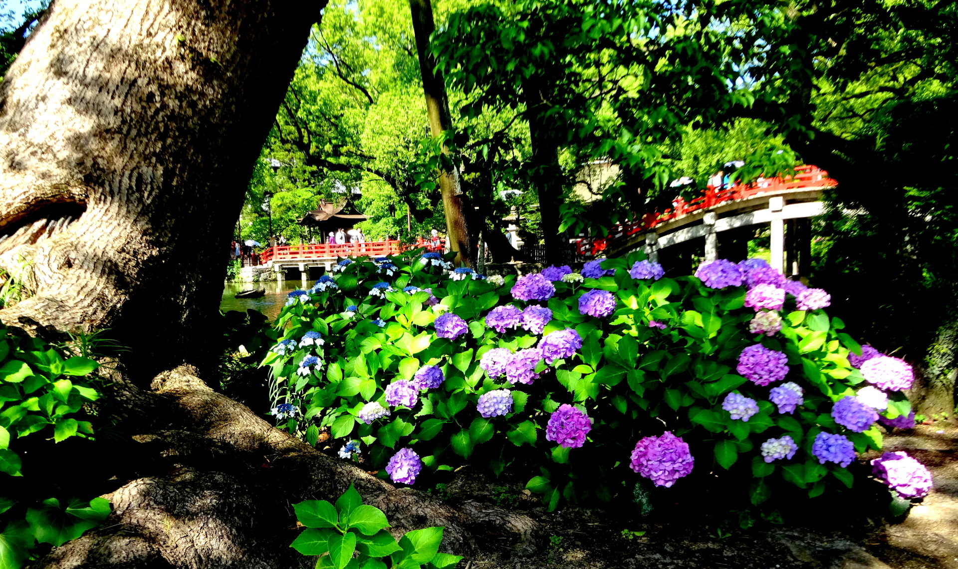 紫陽花と楠の大木の神社参道